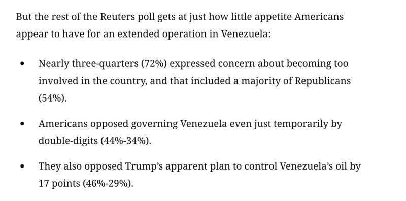 英国路透社、美国彭博社和“政治”新闻网关注到,特朗普上任以来,美国的通货膨胀和民生困顿等诸多难题都未能得到改善,民众不满情绪持续蔓延,针对委内瑞拉的军事行动更是引发国内多方不满。美国有线电视新闻网直言:“在特朗普第二任期内诸多不得人心的举措中,将目光投向‘主宰西半球’或许堪称最具政治争议性的一项。”