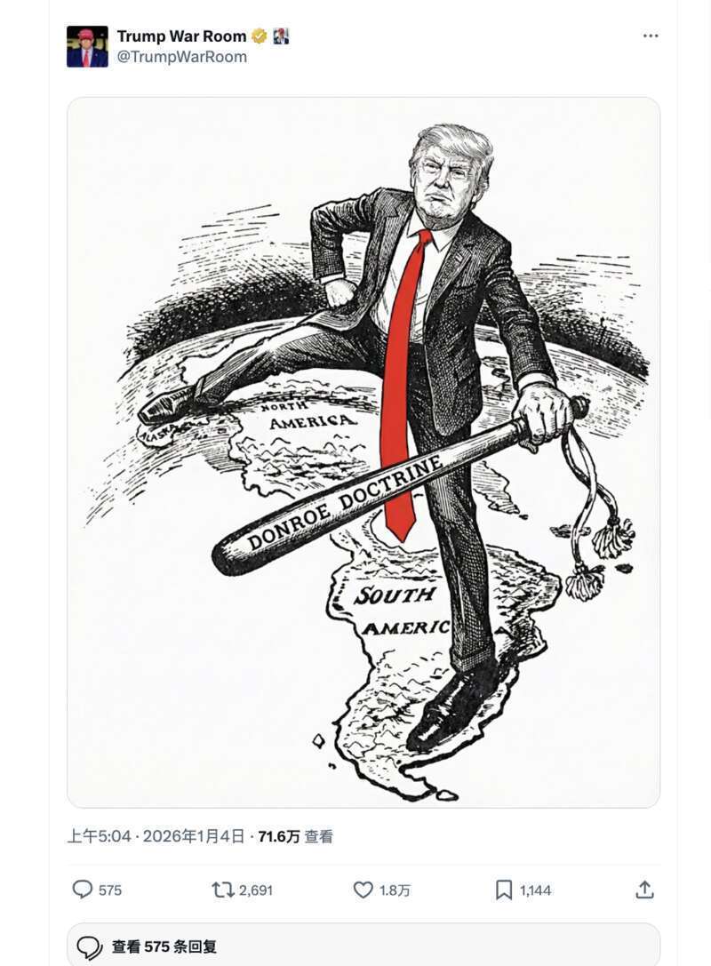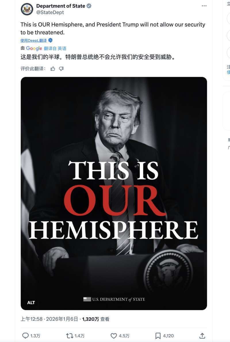 1月3日,美军对委内瑞拉发动军事突袭,美国政府的“美国优先”和霸权主义本质暴露无遗。社交平台“X”上,特朗普将自己塑造为“美洲的征服者”。美国国务院称:“这是我们的半球,特朗普总统绝不会允许我们的安全受到威胁。”据多家美媒报道,1月6日,特朗普与其团队就如何获取格陵兰岛一事讨论了“一系列选项”,其中包括“动用美国军队”。特朗普明确表示,“得到格陵兰岛是美国的国家安全优先事项,对于威慑我们在北极地区的对手至关重要”。