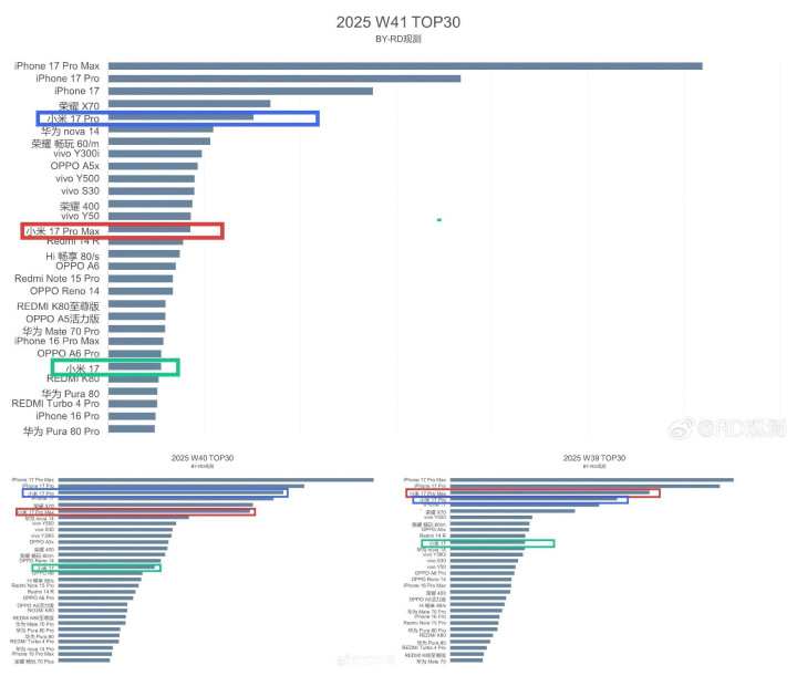 2025年W41,小米17Pro排名第五;小米17ProMax已降至10名开外,排名14;小米17跌出前20,排名26;小米17系列3款机型虽然都进入了前30,但排名对比前2周都出现明显下滑。从W39-W41,小米17ProMax排名从第三降至第六再大降至14名;小米17Pro从第四上升到第三然后下滑至第五;小米17从11名降至15名再大降至26名。