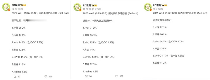 手机和汽车是小米的两大核心业务,目前小米汽车正处于水深火热之中,那么小米手机最近的表现又如何呢?2025年度旗舰小米17系列9月25日发布后,首销非常火热,如今首销逐渐退潮,小米17系列的表现又如何呢?2025年W41(10.6-10.12)国内单机销量榜出炉,小米17系列的3款机型排名大幅下滑,苹果再次包揽前三,华为高端依然稳。