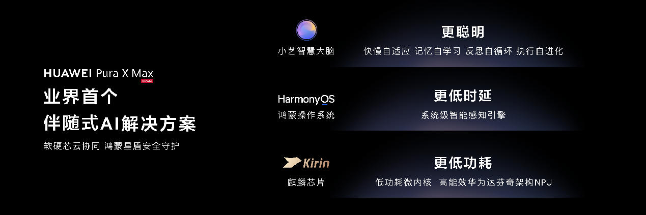 首创小艺伴随式 AI,智慧小艺实现跨越式升级全新小艺智慧大脑,搭载 Agentic 自演进架构具备像人脑一样的记忆、反思、进化能力。华为 Pura X Max 搭载的小艺伴随式 AI,作为业界首创的伴随式 AI 解决方案,依托小艺智慧大脑能力深度融合鸿蒙操作系统和强大麒麟 9030 Pro 芯片,软硬芯云协同实现更低功耗、更低时延、更聪明的使用体验,配合鸿蒙星盾安全架构,筑牢安全防线。与此同时,小艺伴随式 AI 联合滴滴出行、咪咕视频、知乎等众多生态伙伴带来全新伴随式 AI 体验,并将与更多伙伴持续联合创新,开启伴随式 AI 新时代。